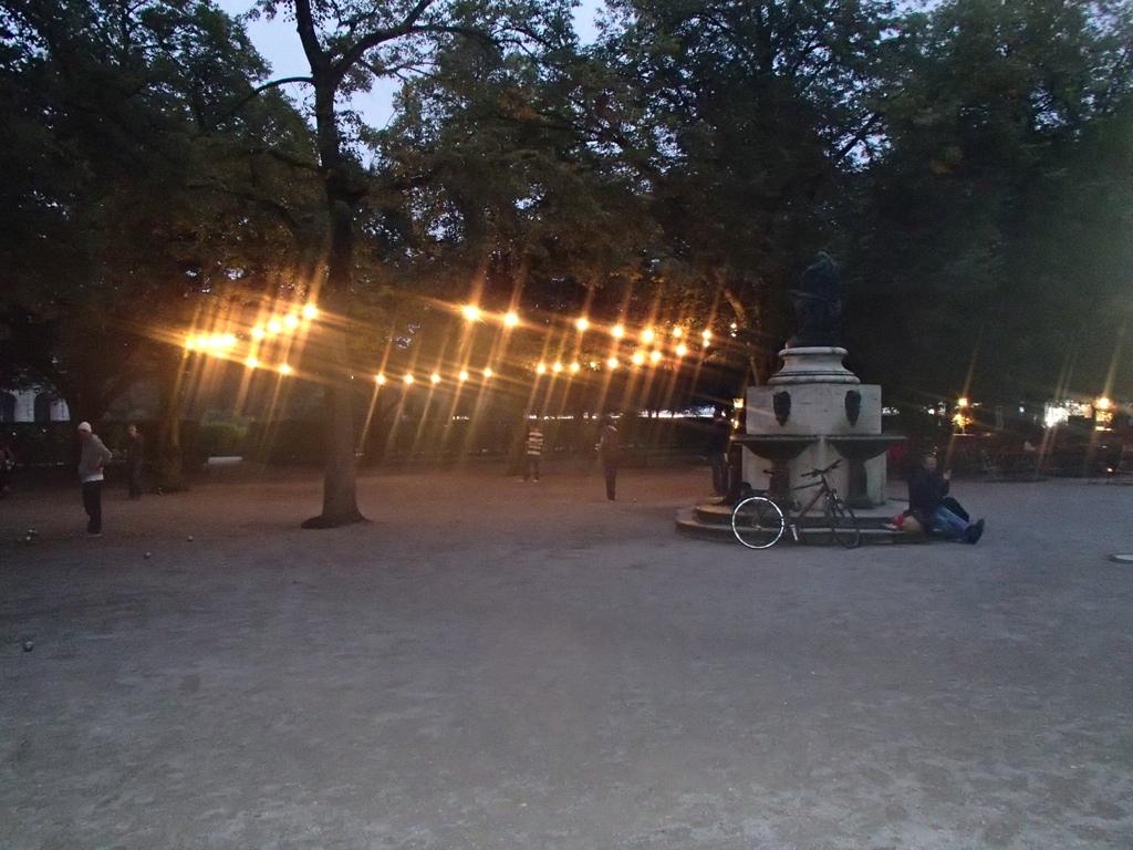 On our way back we found the same group of pleasant people playing bocce ball. I liked the glimmer of the hanging lights in this shot.