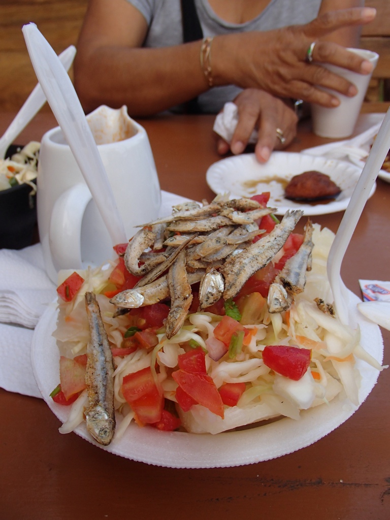 To enhance our journey, we decided to order a few traditional goodies for the table to share. This is a bowl of boiled cassava root with curtido (a pickled cabbage, onion, tomato and carrot topping) and pescaditas (fried baby sardines).