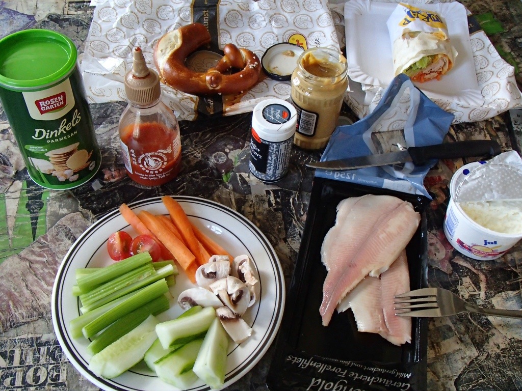 Our fancy meal of the trip was sword fish, stuffed mushrooms and greens. Followed of course, by the complimentary dessert and drink. Sorry, we devoured the delicious mushrooms before I took this photo.