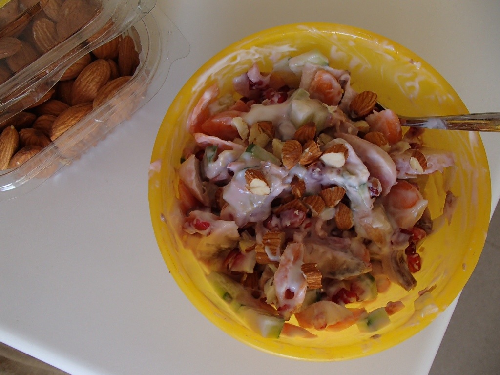 A morning market treat for me was pomegranate and Greek yogurt. I added lime juice to make it into a dressing for my carrot, cucumber and mushroom salad. Top it with crushed almonds and viola, a scrumptious breakfast!