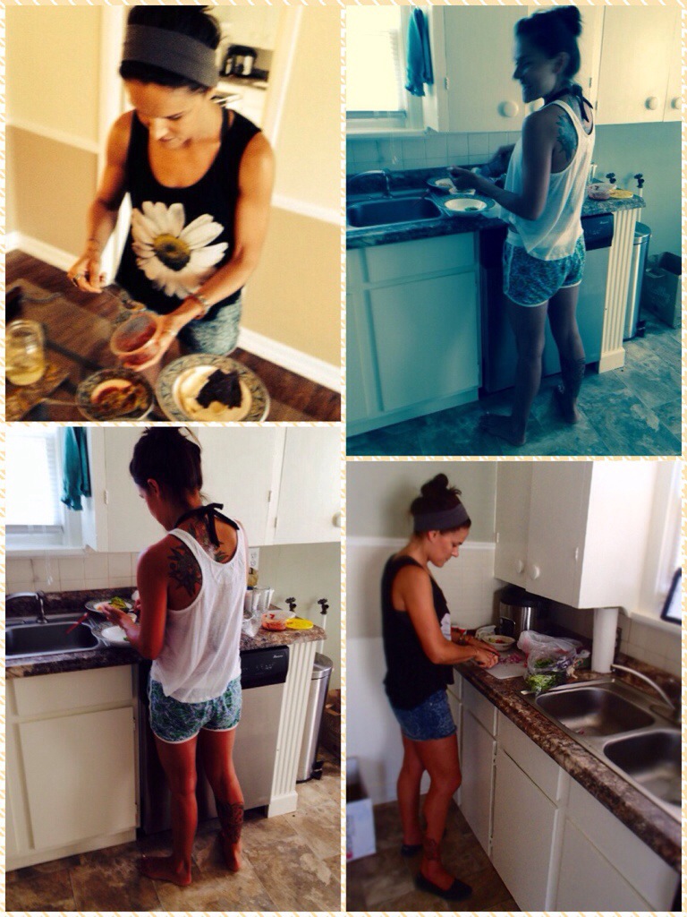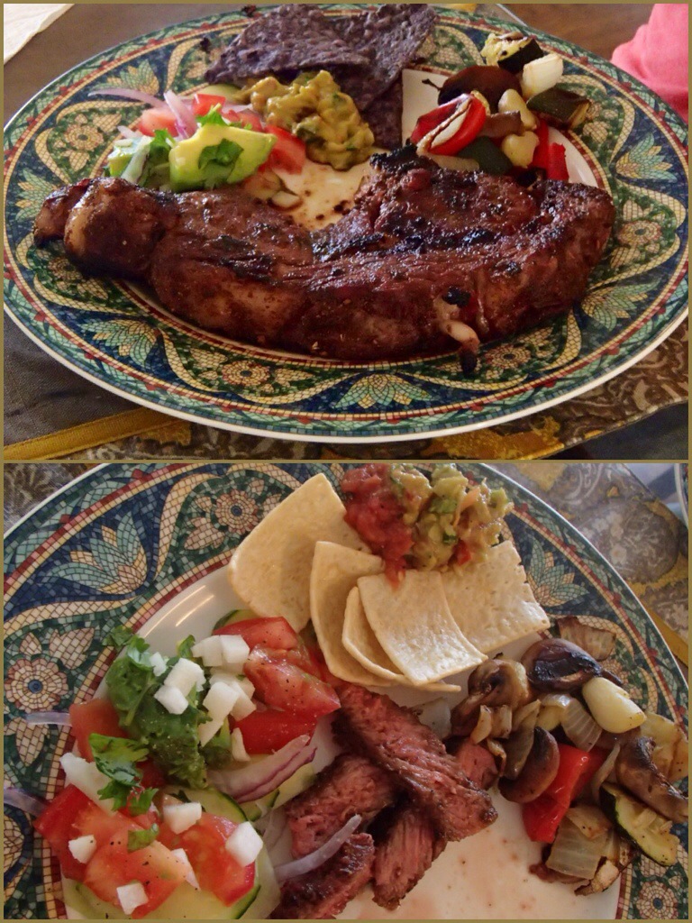 The result of our powers combined equaled a huge hunk of meat and my roasted veggies, a cucumber-tomato-onion salad with a side of homemade guacamole and salsa with lentil chips. Yum.