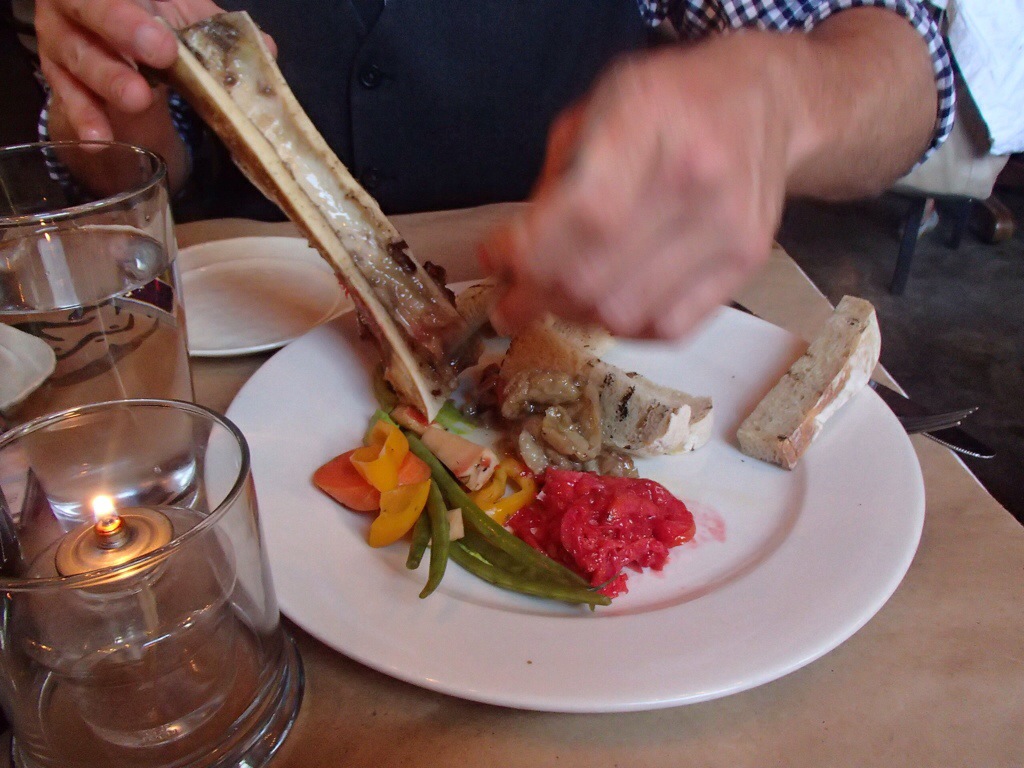Our selection for the appetizer was bone marrow. Notice how he just pushed the interior mass into a pudding-like pile. The first taste to hit my palette was salt. Not a “salty” flavor, but actual sodium… like I licked a salt shaker. There wasn’t a second flavor due to the speed in which I removed it from my mouth. Hmmm, no thank you.