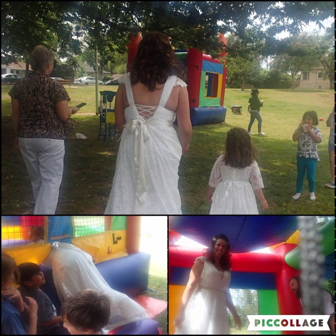 3:45p- Magic happened! Call it a gift from the universe, perfect timing, coincidence, a blessing… Whatever you want to classify it as… It happened! After lunch a child’s party unloaded right next to us with none other than a bounce house! Our bride got her wish.