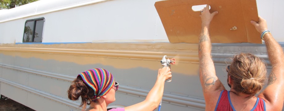 Then came brushes and rollers? Nope. We were lucky enough that Bryan just happened to have a paint sprayer! This grey primer you see here helps the final paint adhere to the exterior bus walls. Not gonna lie, I kind of dig the color.