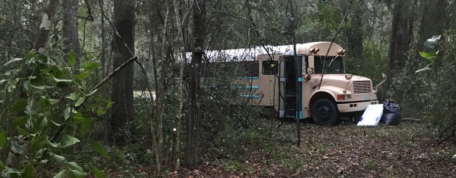 Here’s a bus review of the past couple of months! Nuts, bolts, hammer, nails, welders, wires, plugs and power! Before we dive into the interior, here’s where our baby has been parked. Do you recognize the location? Of course not! It’s in the sticks of the woods, in the middle of a town on the outskirts of a city near a beach highway in Northwest Florida.