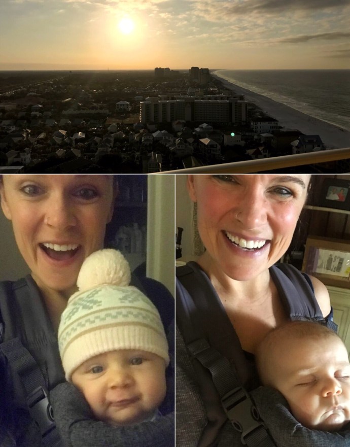 I’ve been successful at the walking and stair climbs! Our little girl has been growing and becoming more aware of when moms not around so last week I thought, meh, why not take her with me? So at 5am I strapped her in and up we went! Below is the view from the top, that’s something to work for! The selfies are us before and after the climb, clearly she really wore herself out being my workout partner!