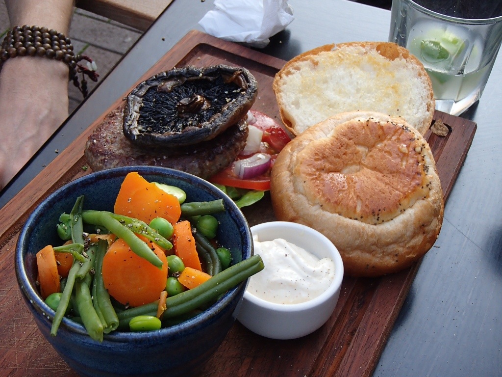 First dinner for the boys in England? They went with fish n’ chips and a juicy hamburger with veggies. Dessert made up of a sweet fruit cider.