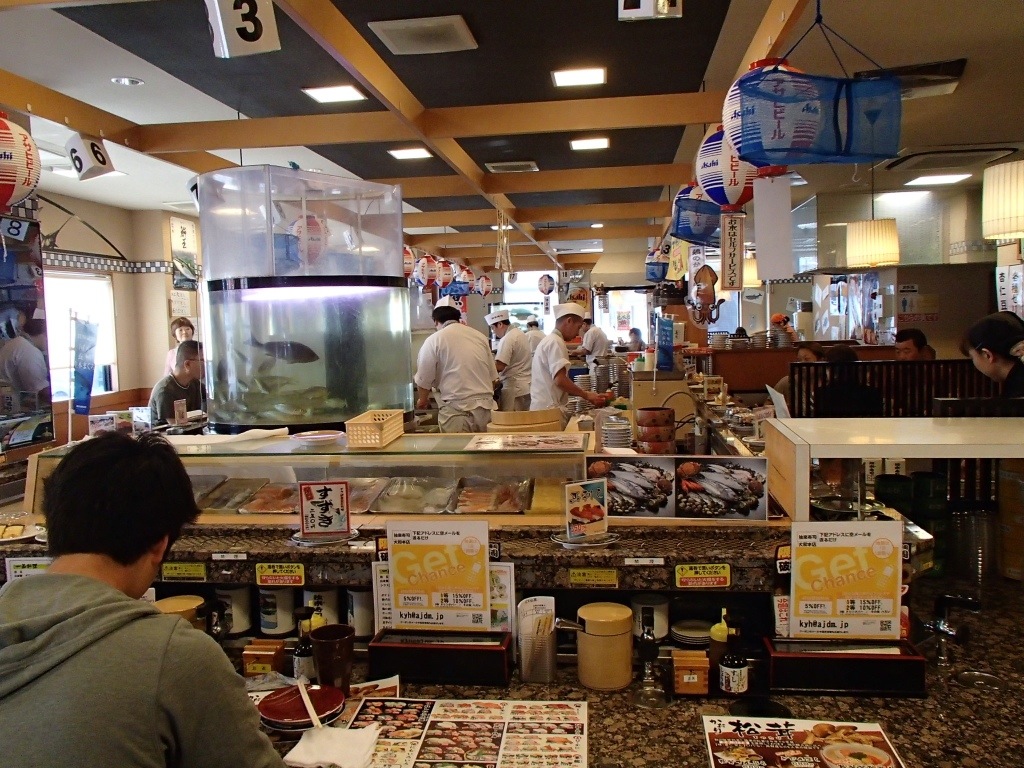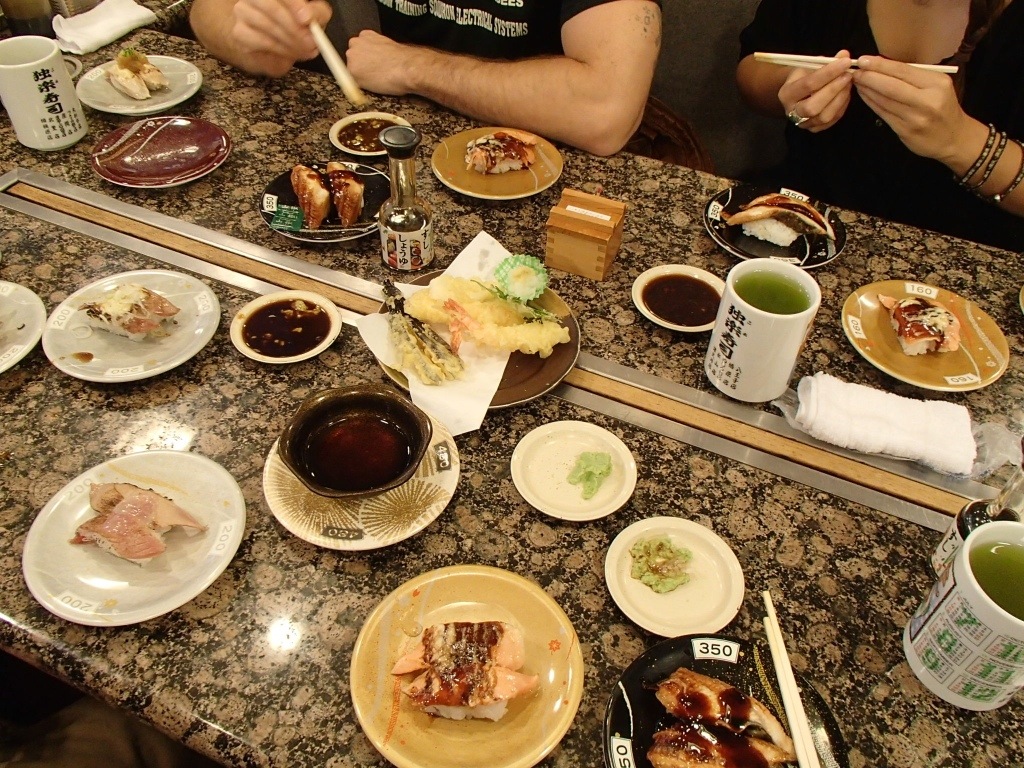 For our sushi experience, we got a group together at a local spot. This place has pictures on a huge menu, floating appetizers circling the bar and a very friendly staff.