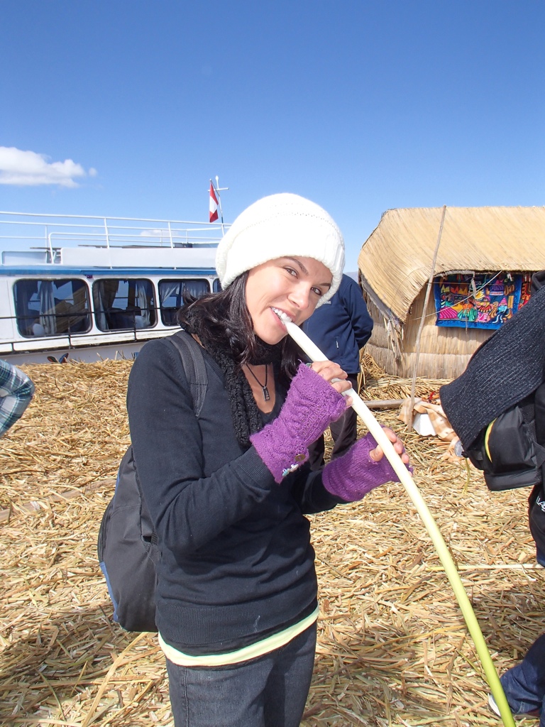 Stepping onto the floating island gave you the sensation of walking on a mattress or firm trampoline covered in thick straw. Whether or not the natives were thrilled to have company, they maintained gentle smiles as they welcomed us. We got a lesson on a Totora reed that is often eaten for iodine, can be used to treat hangovers and used in tea. When in pain, the reed can be wrapped around the wound for relief and if it is hot outside, they roll the white part of the reed in their hands and split it open, placing the reed on their forehead as it’s cool to the touch. It tasted like fresh celery and lettuce, yum!