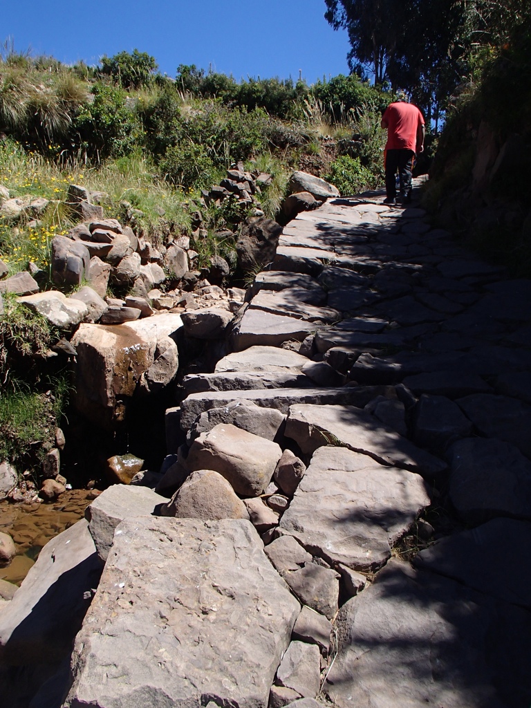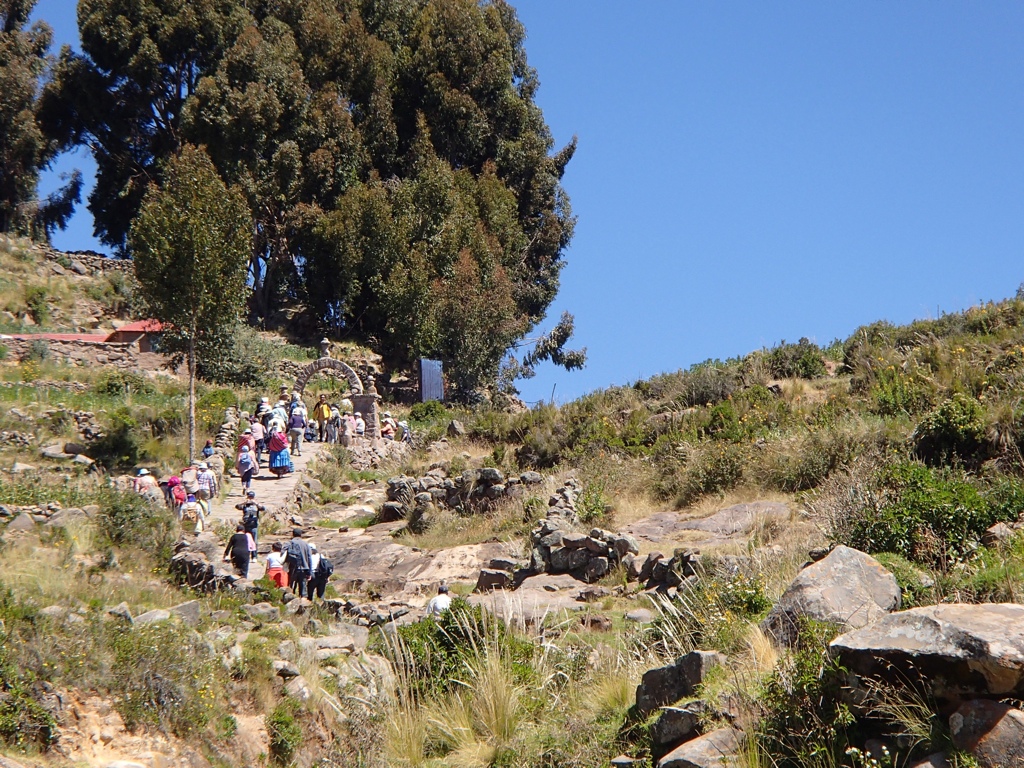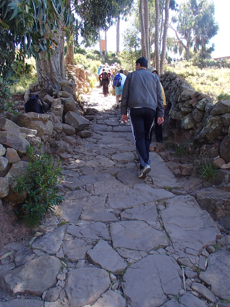 After about an hour we headed for one of the largest islands called Taquile. Once you dock, it’s a solid climb to the central plaza for a gorgeous panoramic view. I hope the photos give you at least a partial idea of the incline that these natives live with everyday. Keep a lookout for the elderly man carrying stock up the hill behind me!